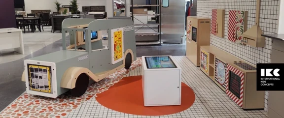Die Spielelemente wurden mit dem Tepperman-Branding versehen, sodass sich die IKC-Kinderecke nahtlos in die Atmosphäre des Geschäfts einfügt. Vor allem der große Spielbus wurde einer wahren Metamorphose unterzogen und mit dem Tepperman-Logo versehen, das einen Hauch von Nostalgie verströmt.