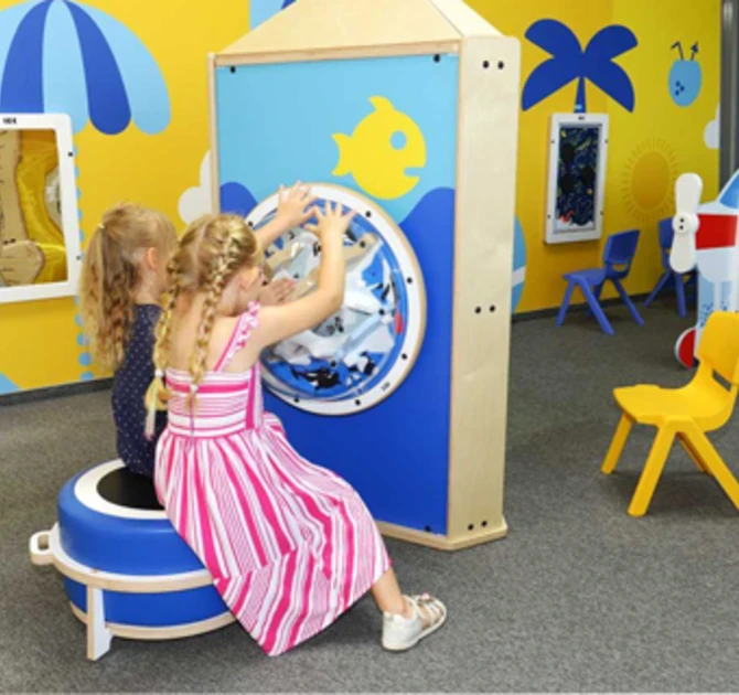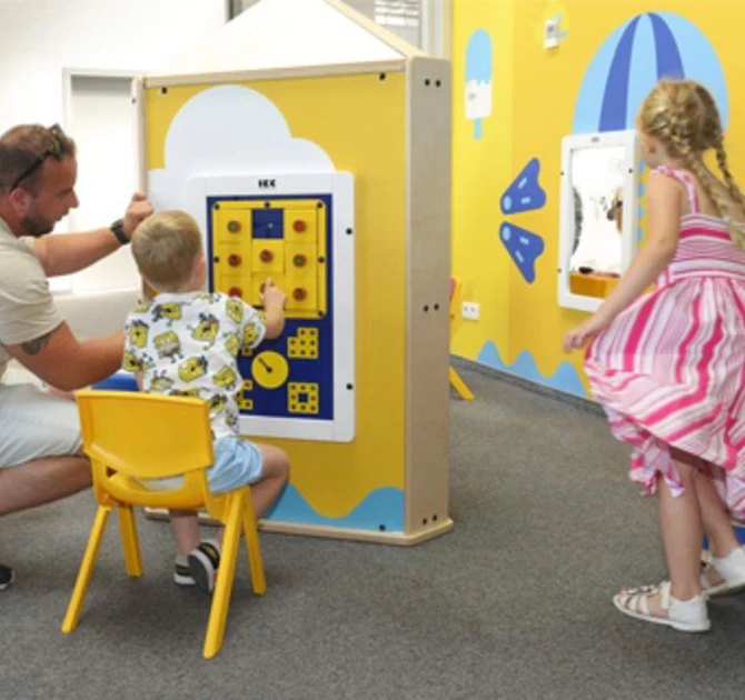 Die Kinderspielecke steht ganz im Zeichen der Luftfahrt, was sich in der Forex-Tapete und dem Splash Down-Spielsystem widerspiegelt. Die modernen, verspielten Module fördern die Kreativität und Bewegung und sind daher ideal für Kinder von 2 bis 8 Jahren. Die verschiedenen Wandspiele, wie das Square Logic, der Calculator und das Wheel of Emotions, ermöglichen es den Kindern, verschiedene Spielformen zu testen und ihre Interessen zu entdecken.