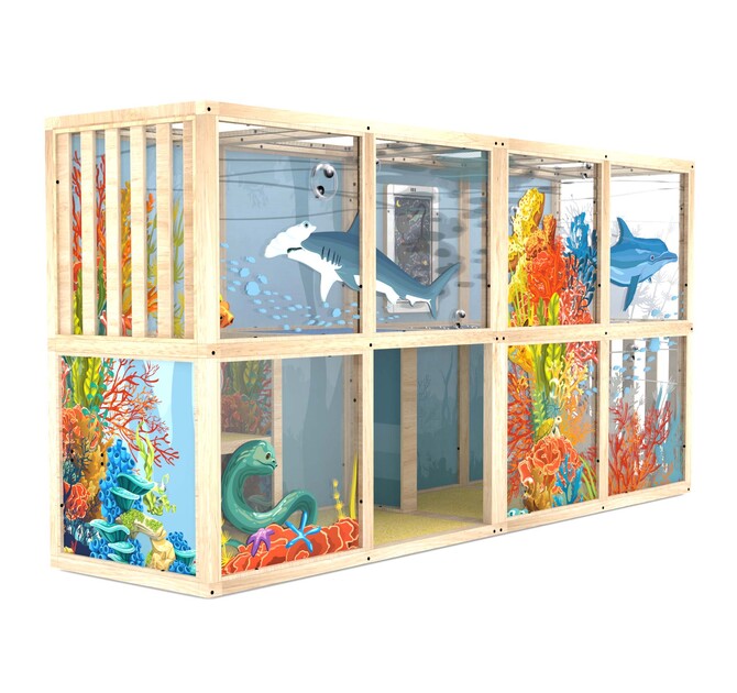 Dieses Play@IKC-Konzept ist ein wahres Unterwasserparadies an Land! Durch die bedruckten Polycarbonatpaneele entsteht bei diesem Konzept eine lichtdurchflutete, verträumte Unterwasserwelt. Die Kinder können auf dem Weg zur Unterwasserrutsche zwischen den Fischen und Haien „schwimmen“.