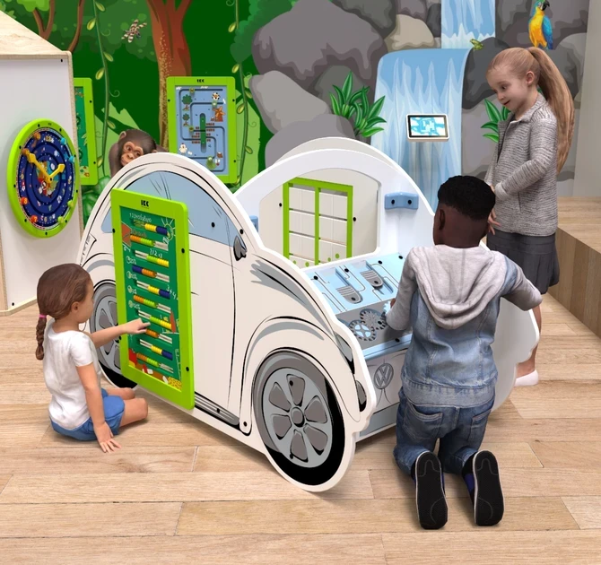 Spielsystem IKC Beetle ist ein Spielelement in der Form eines VW Käfers, auf dem zwei rechteckige Wandspiele montiert sind. Das Spielsystem kann als eigenständiges Spielelement oder als Teil einer größeren Spielecke eingesetzt werden.