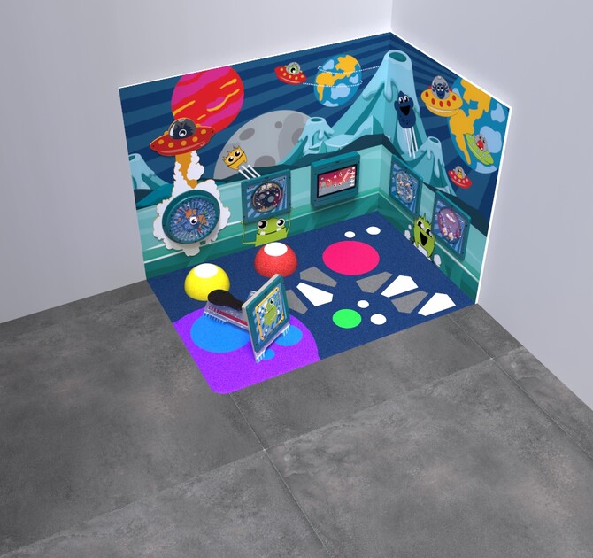 This kids’ corner contains wall and floor decorations, four play modules on the wall, play system Space scouter, and one 21 inch touchscreen. The touchscreen comes with our Galaxy explorer software. This educational and non-violent software is especially developed by the IKC studio and contains 12 games that are suitable for children from 4 to 8+ years old. It is also possible to choose one of the other software options.