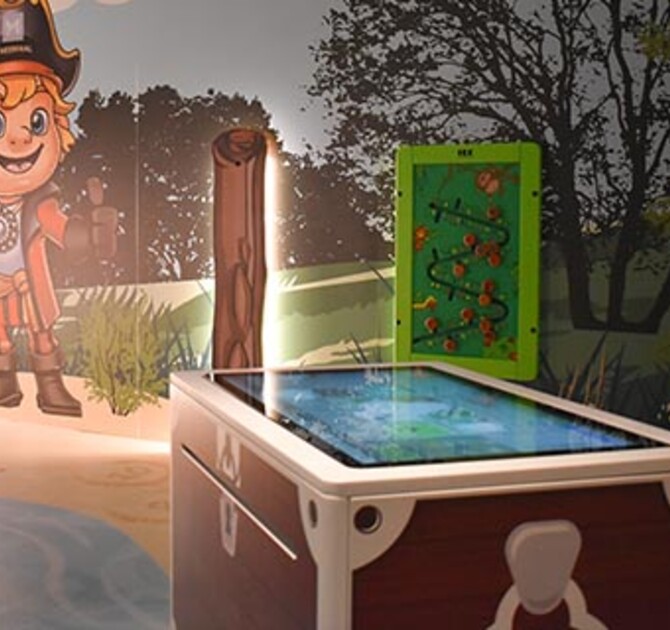 We transformed the 32 inch touchtable into a large treasure chest. With this treasure chest children can have fun by playing various interactive games. To complete the experience, we placed a fence combination to look like a pirate ship.