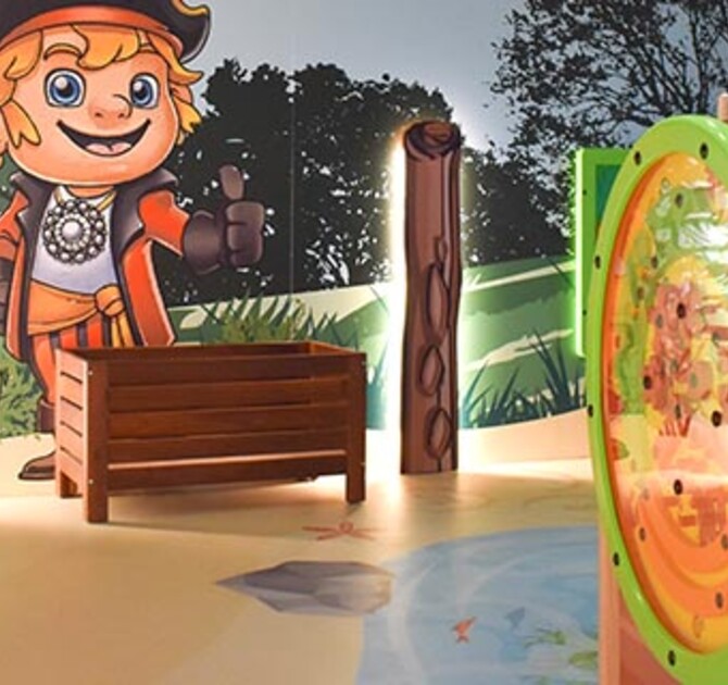 The management requested the creation of a area where children can play in a themed environment. IKC created the play corner in a Pirate Theme. We included the wall and floor decoration. Here, children will encounter different pirate elements.