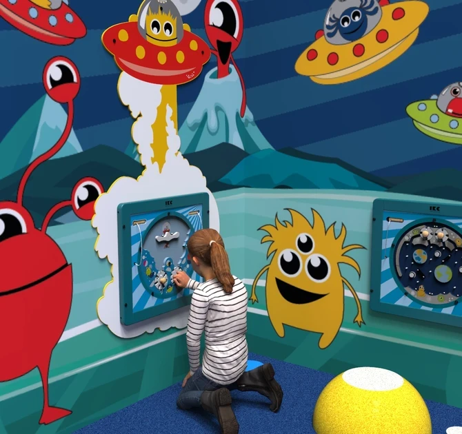 Wall panel Transporter pm is a panel especially for mounting a square wall game on the wall. The panel has the appearance of a spaceship with monster in it.