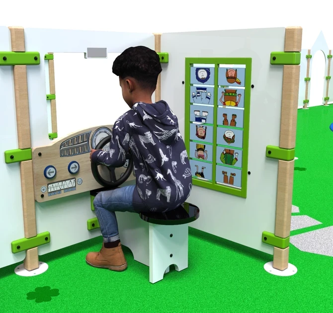 Fence Dashboard is a play panel that contains a dashboard with steeringwheel. It is a real temptation for children to get behind the wheel and drive away into their own world of imagination.