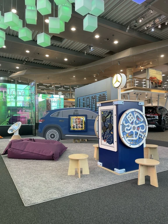 Welcome to the Mercedes-Benz Customer Center in Sindelfingen, where innovation, luxury, and experience come together. From the stylish reception area to the moment customers take delivery of their brand-new vehicle, everything here revolves around creating the perfect brand experience. With the addition of a brand-new children’s corner, Mercedes-Benz is now focusing fully on its youngest visitors as well. In collaboration with IKC, a playful, educational, and brand-aligned children’s environment has been created – a place where the experience is truly designed at child level.
