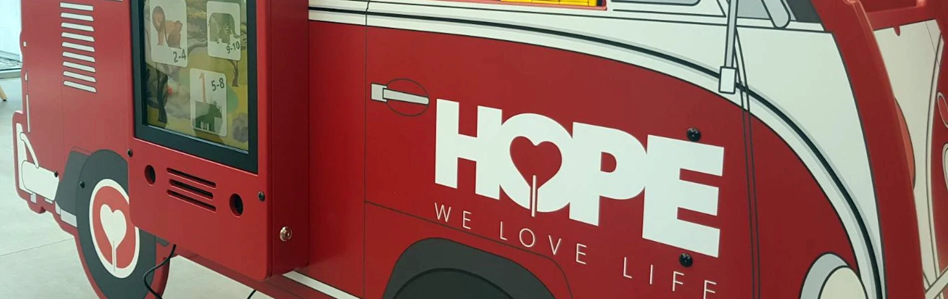 In cooperation with HOPE Benefiet, the HOPE on wheels has been developed to stimulate the imagination of children and to take them to a bright future. The free-standing eye-catcher is placed plug-and-play at healthcare institutions, after which children can enjoy themselves in and around the bus through wall games and an interactive play system.