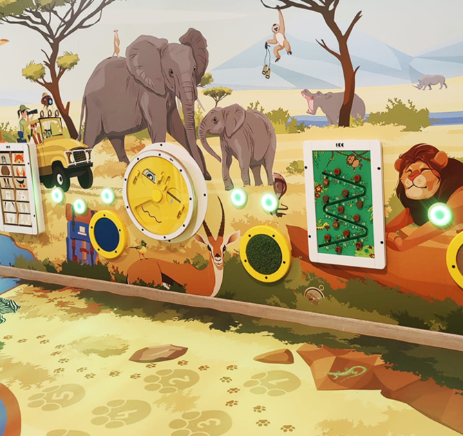 De Wondere Wereld in Schilde features an impressive safari theme. The experience wall and custom vinyl flooring blend seamlessly with the adventurous atmosphere, making children feel as if they’ve stepped into the African wilderness.