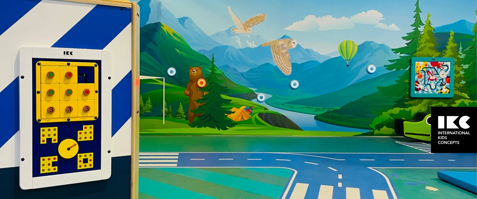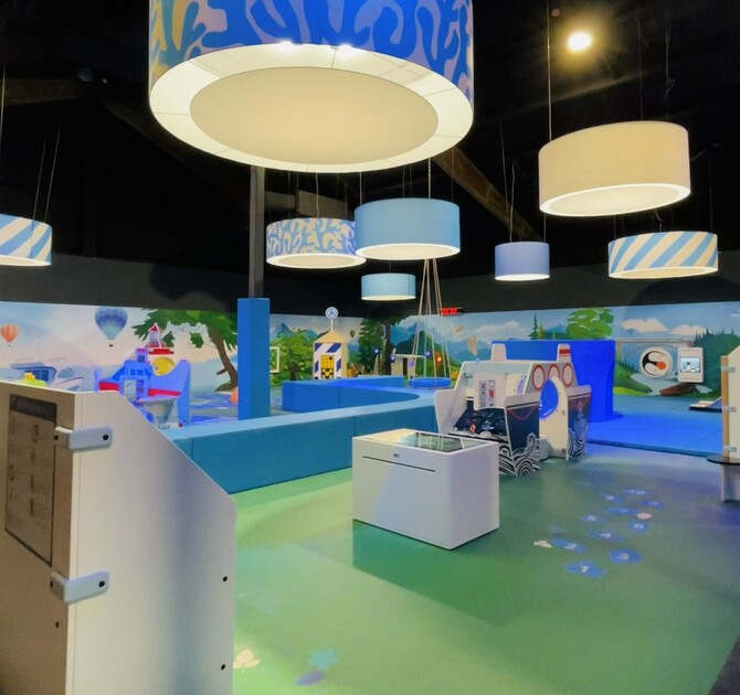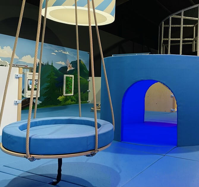 The vinyl flooring has a dynamic layout, from winding paths to hopscotch lanes where children can ride and jump to their heart's content. On this floor, the Delta 32-inch touch table can be found, where up to 4 children can play games simultaneously. In this space, there is also a special (fixed) swing for the youngest children. Parents can lay their newborn baby here and rock back and forth.