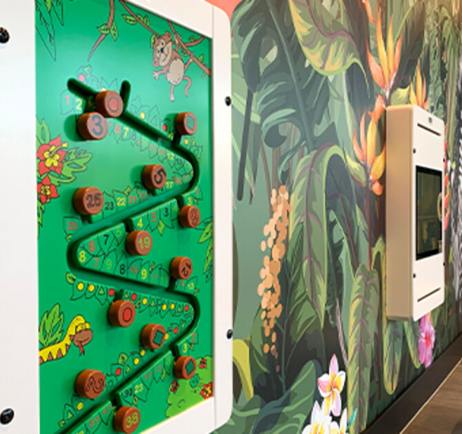 Children can take a seat on the buxus high chairs, while playing with one of the wall playmodules or interactive okay systems. They will also encounter the buxus beadstree table and the softplay balancer.