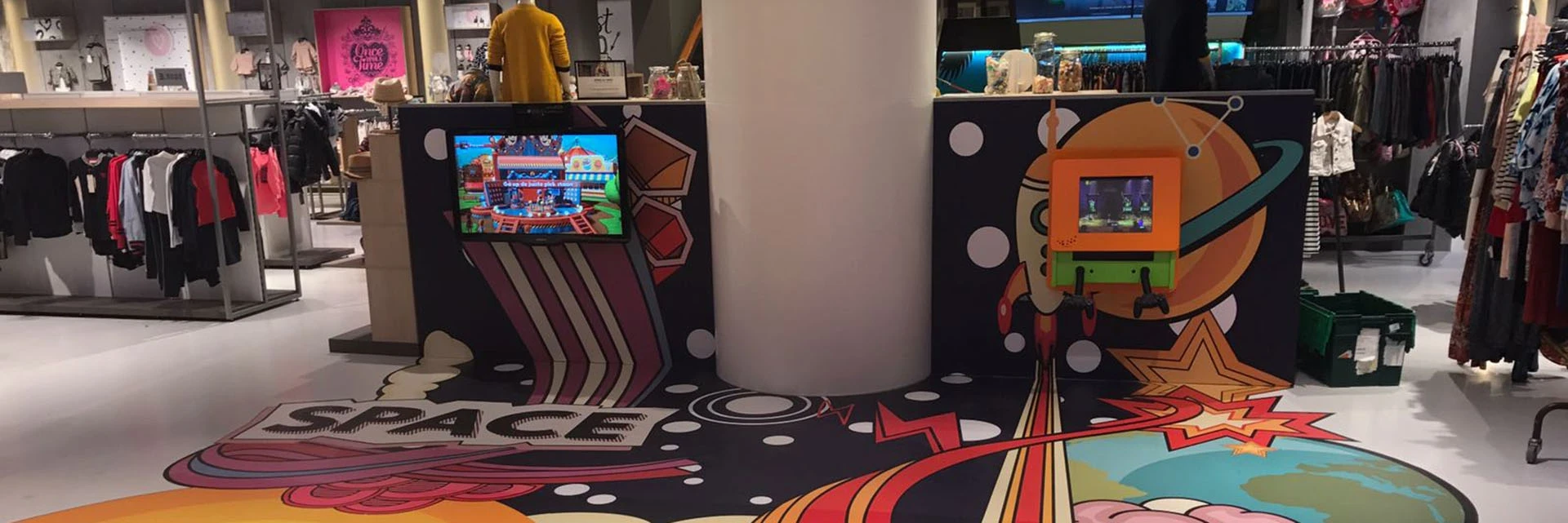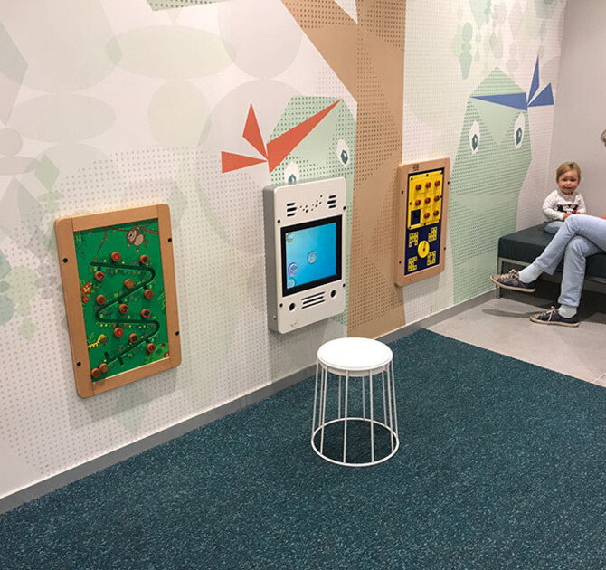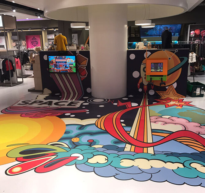 At the customer’s request, we gave some of our standard products a custom twist. Not only the gigantic floor sticker has been especially designed for this location, but also our Delta 17-inch interactive play system has been adapted to facilitate smartphone chargers.