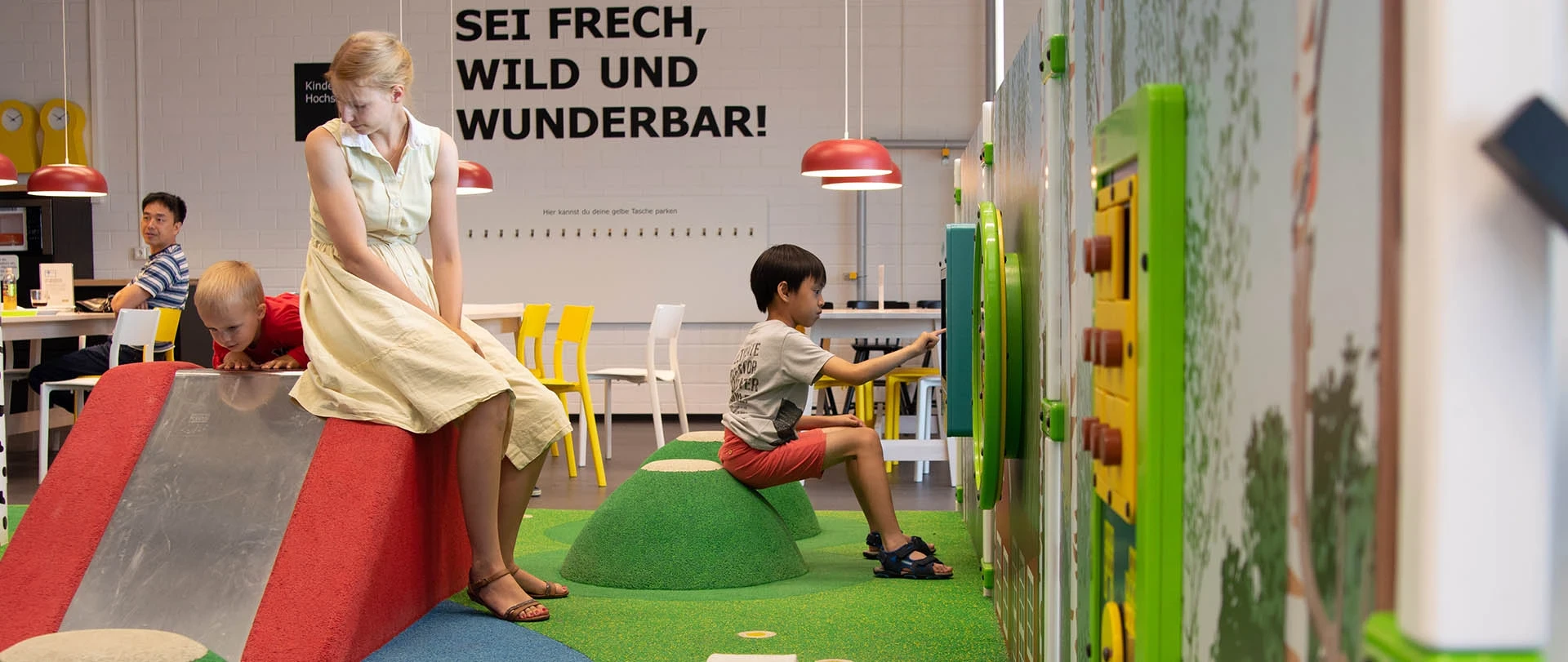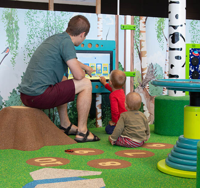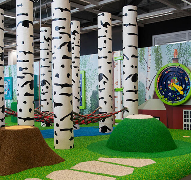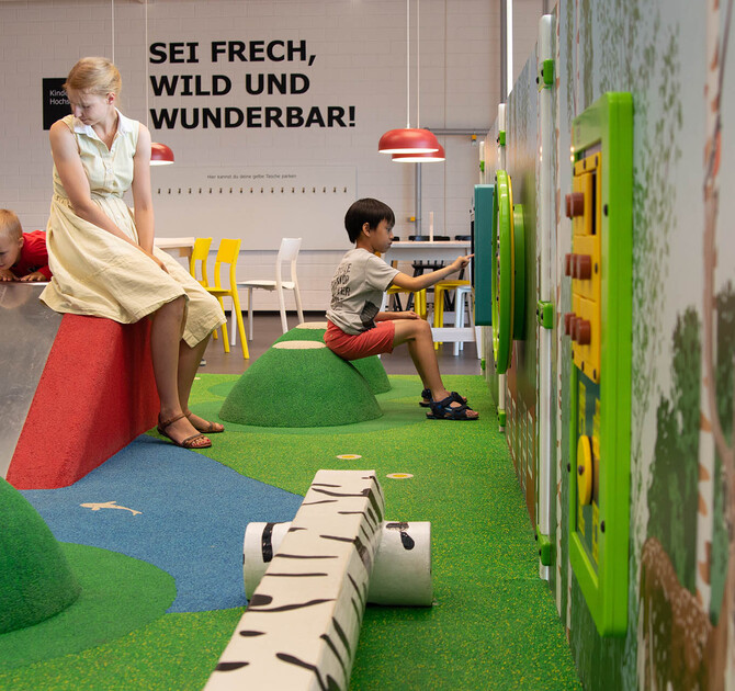 In the middle of the restaurant of this furniture store, a place has been created where children can play to their heart's content. By combining different types of play solutions, children will find both physical and mental challenges in this wonderful kids' corner.