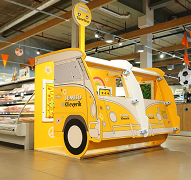 The unique kids' corner shaped like a bus also has a special background story. "We asked ourselves what we would be nice idea." When Jumbo Klieverik saw the IKC Van, inspiration finally hit. In real life there are also fun, yellow Jumbo-themed buses - the ideal concept to turn into a kids' play corner!