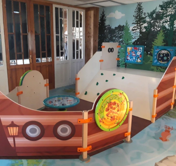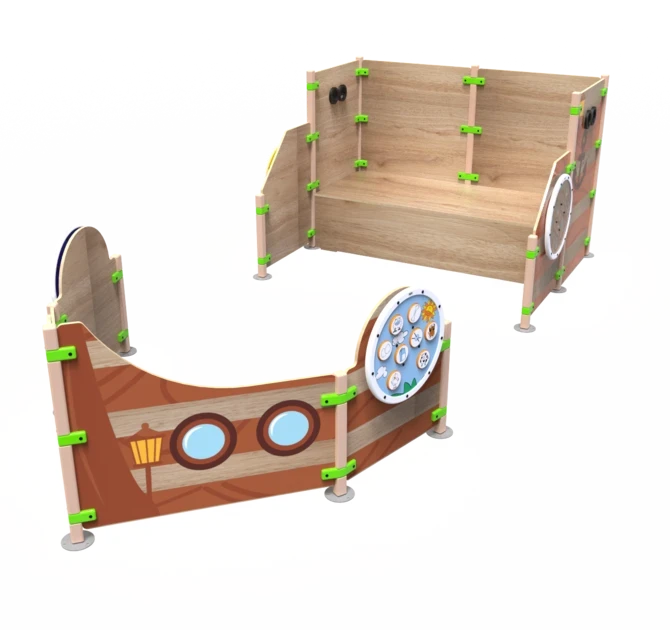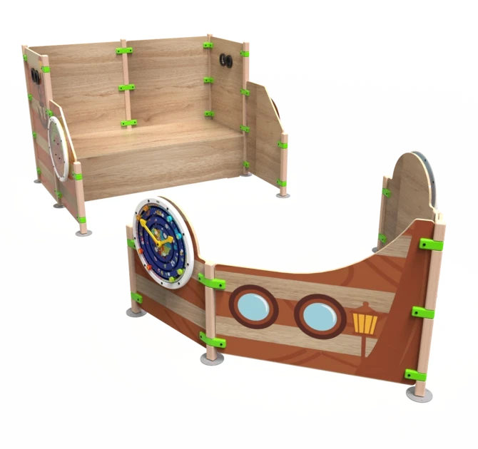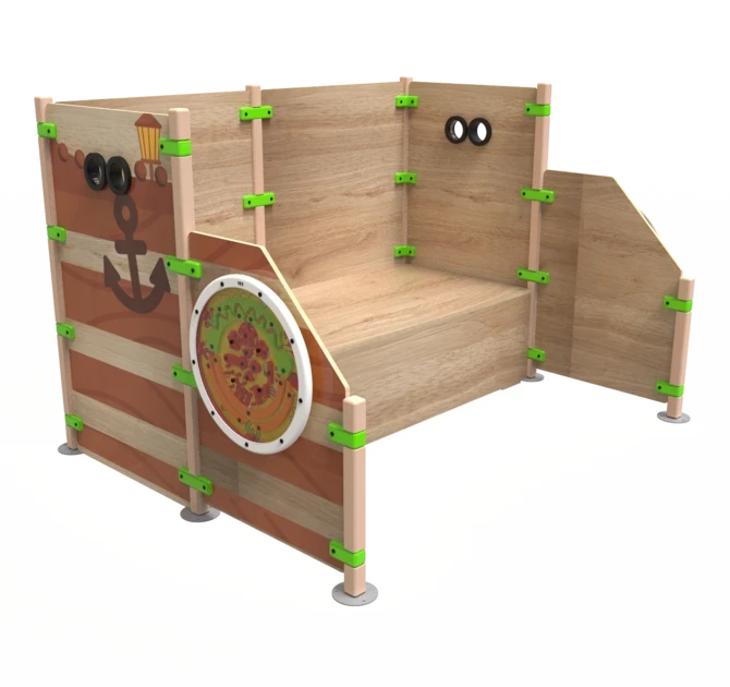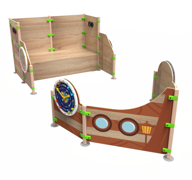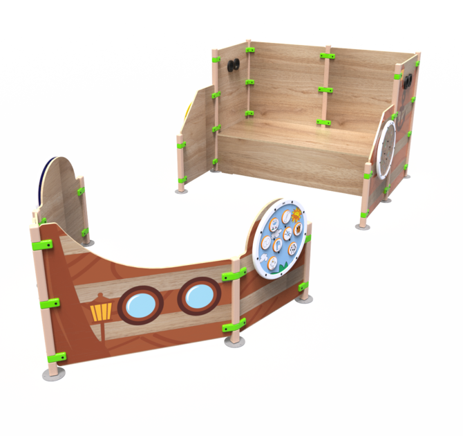 Playhouse Ship ahoy is a playhouse that consists out of several playfences and is shaped like the front and back of a ship. Four round play modules are mounted on to the outside of the ship. Ship ahoy contains a raised platform where children can climb higher to have a look through the binoculars. The playhouse can be used as a stand-alone play element or as part of a larger play corner.