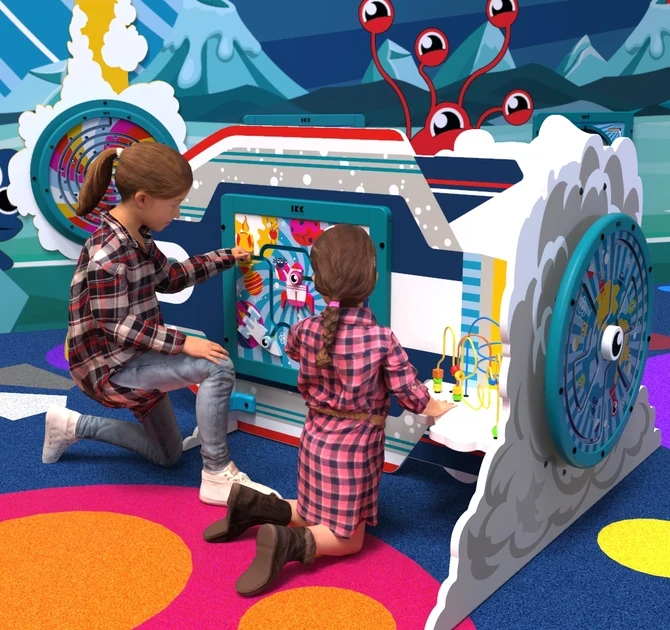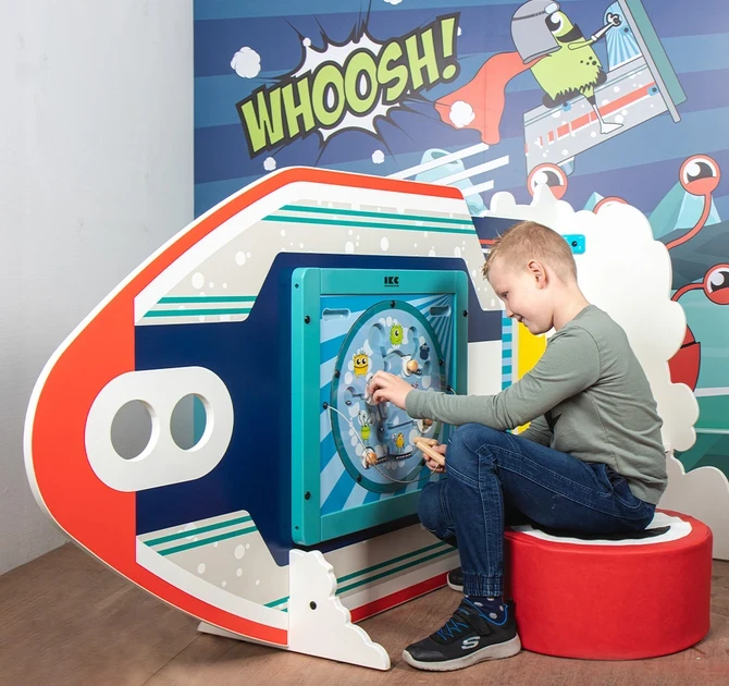 Playsystem Jump ship is a play element in the form of a spaceship, on which two game modules and two bead tables are mounted. The play system can be used as a stand-alone play element or as part of a larger play corner.