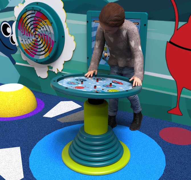 Swinging top galaxy play system is a play element in which a play module is placed on a weighted round leg. Balance the plate to get the 4 balls in the holes. The play system can be used as a stand-alone play element or as part of a larger play corner.