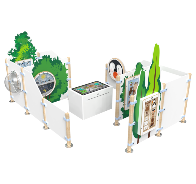 This ready-to-play kids corner is made of eleven fences with nine play modules and a Beadstree table. In addition, you'll find a Delta 32 inch touchtable that contains special software suitable for children from 6 to 12+ years old.