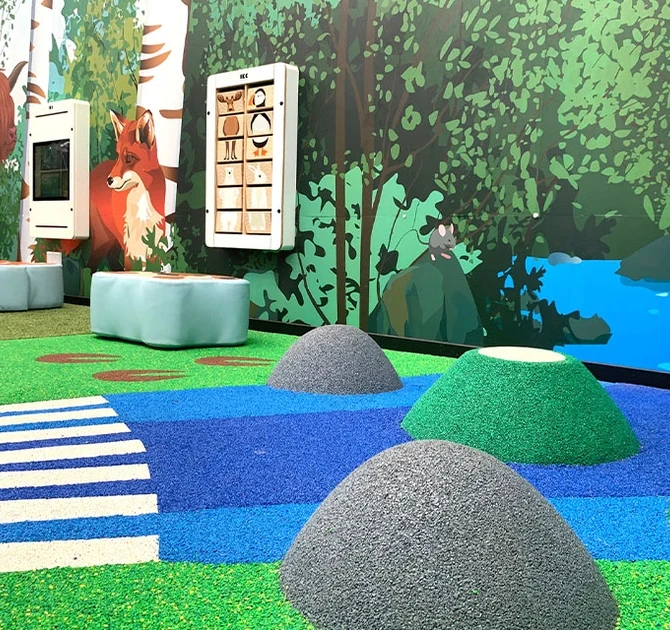 The restaurant can accommodate 200 people, the children's corner is a real eye-catcher in the space. The use of natural elements on the wall gives children the feeling of playing outside. That makes this kids’ corner suitable for the garden centre. Safety comes first, that's why we chose an EPDM floor. Children can play safely on it without getting hurt. IKC designs and produces these floors itself, which means that we can produce a floor for every room and in every house style.