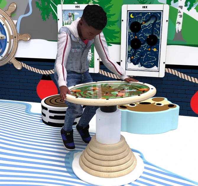 Swinging top maze play system is a play element in which a play module is placed on a weighted round leg. Balance the plate to get the little ball in the hole. The play system can be used as a stand-alone play element or as part of a larger play corner.