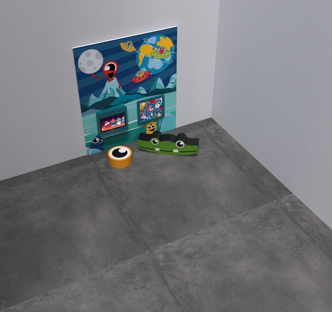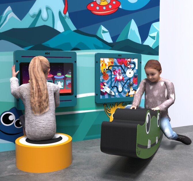 This kids’ corner contains wall decorations, two softplay elements, a play module on the wall and an interactive play system with a 21 inch touchscreen. The touchscreen comes with our Galaxy explorer software. This educational and non-violent software is especially developed by the IKC studio and contains 12 games that are suitable for children from 4 to 8+ years old. It is also possible to choose one of the other software options.