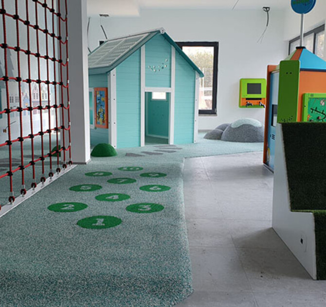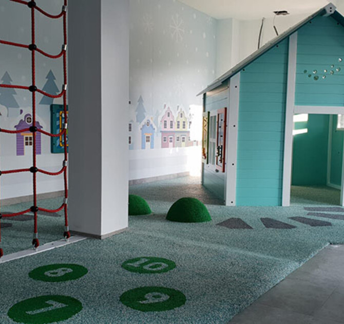 At Alpenland Fieberbrunn we turned the children’s area into a winter wonder world at request from the customer. On top of playing actively, children can enjoy themselves with interactive play systems and wall games. The shock absorbing EPDM floor stimulates children to actively move around and offers them a safe space to play in.
