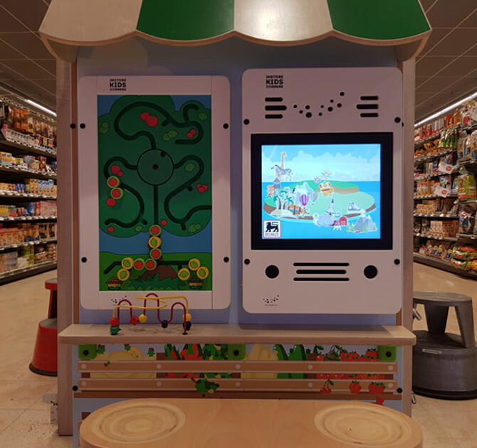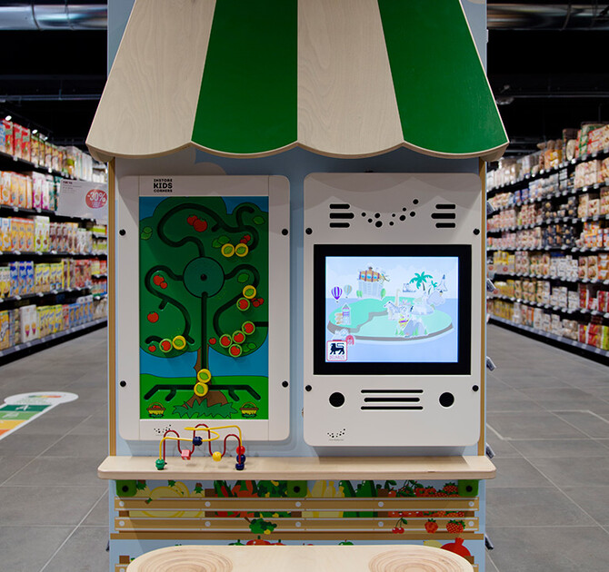 The Delhaize kids' corners offer play value to children of all ages. With an IKC sorting tree and wire beads, the youngest visitors can sort apples and beads and work on their fine motor skills. For kids from the age of 4, an interactive play system with supermarket games was added. The special Supermarket software contains 11 games with themes like farm, fruit, nature and family. All games are custom made, designed by our own game developers.