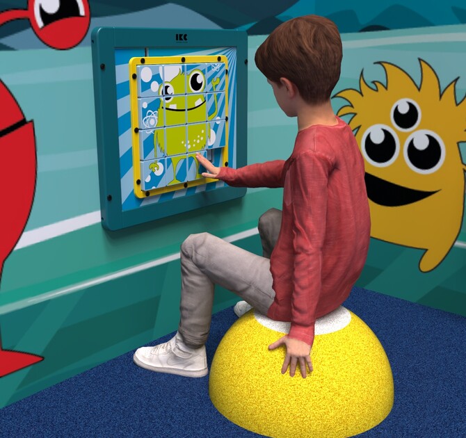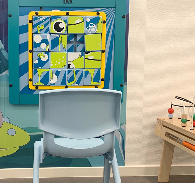 The square wall game can be attached to the wall or to an IKC play system, so it doesn't take up a lot of space. The frame is made of strong beech wood which is easy to clean. The Sliding Puzzle Monster can be combined with IKC softplays and furniture.