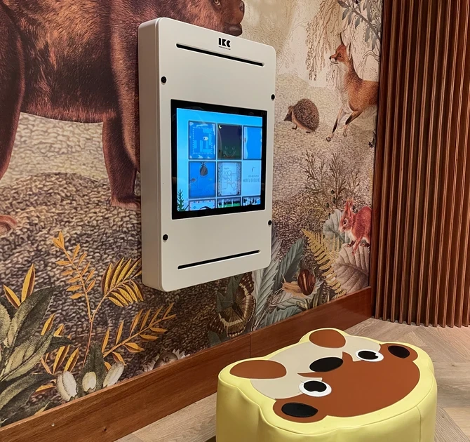 The children's corner offers a combination of analog and interactive play, including a custom soft-play Otto in soft yellow. The play corner fits seamlessly into the warm atmosphere of the restaurant.