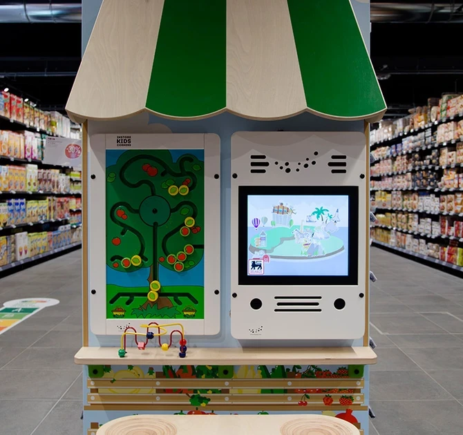 The Delhaize kids' corners offer play value to children of all ages. With an IKC sorting tree and wire beads, the youngest visitors can sort apples and beads and work on their fine motor skills. For kids from the age of 4, an interactive play system with supermarket games was added. The special Supermarket software contains 11 games with themes like farm, fruit, nature and family. All games are custom made, designed by our own game developers.
