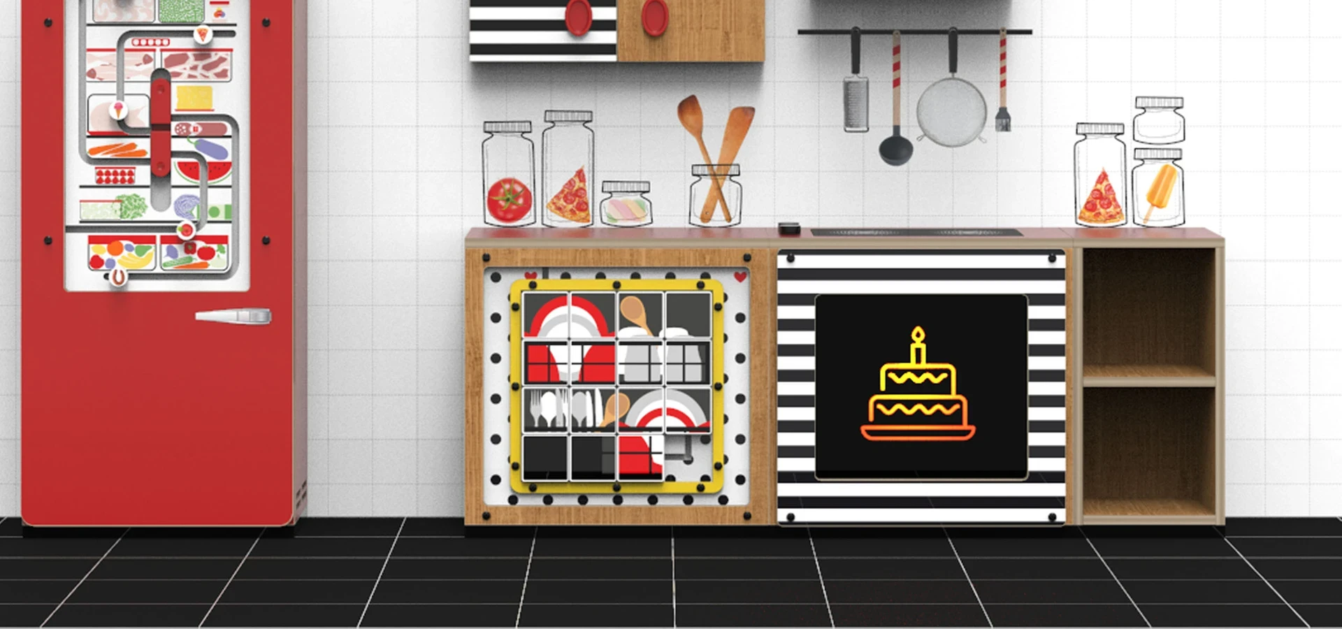 The play concept consists of multiple modules that can be mixed and matched to create a play corner of any size. For example, parts of the play kitchen are equipped with a wall game or interactive touchscreen and they can be combined as desired. Both the wall game and the software have been customized to suit the HEMA branding.