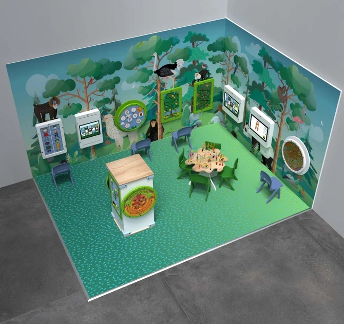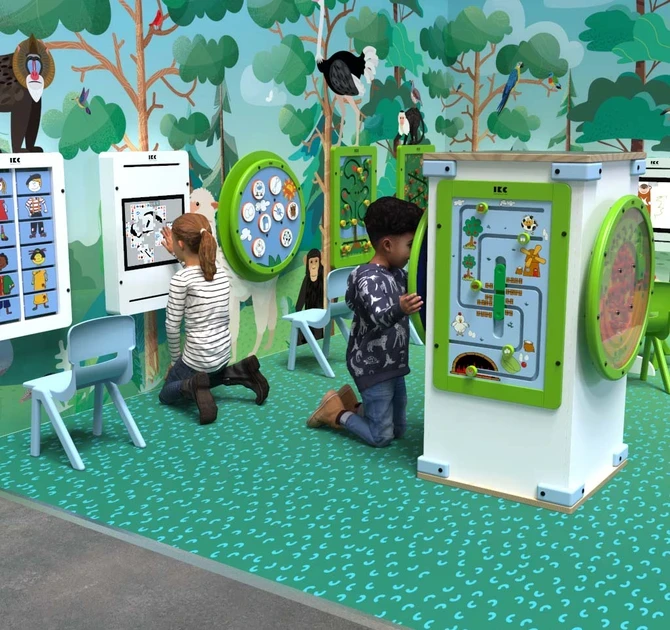 This kids’ corner contains wall and floor decorations,eight fun chairs, five wall games, a Beadtree table and play system Four fun with four play modules. Additionally, the play corner offers three interactive screens. One interactive with a 17 inch touchscreen and the other two with a 21 inch touch screen. All touchscreens come with our Arctic adventures software. This educational and non-violent software is especially developed by the IKC studio and contains 14 games that are suitable for children from 4 to 8+ years old. It is also possible to choose one of the other software options.