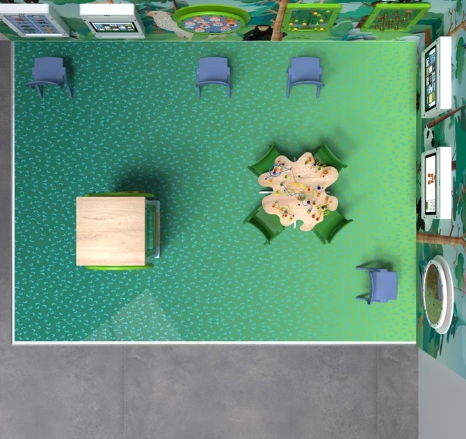 The standard wall and floor designs that come with this corner are made of printed Forex on the walls and printed vinyl on the floor. The total floor space is 12 m². If required, the concept can be adapted to suit your wishes, style and colours. Find more pre-planned, ready-to-play kids’ corners here.