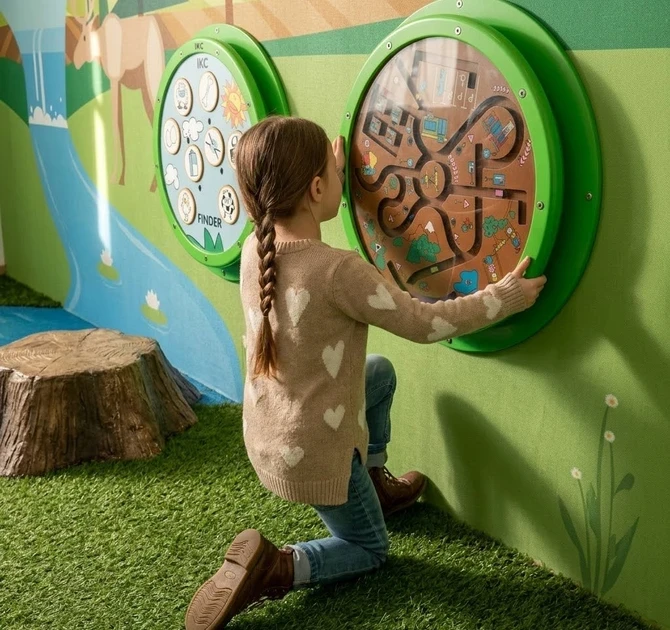 By turning the Road Trip, children can drive the cars around the world. This wall game supports the development of the hand-eye coordination of the children and appeals to their responsiveness.