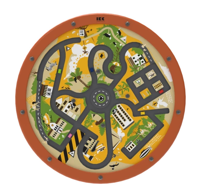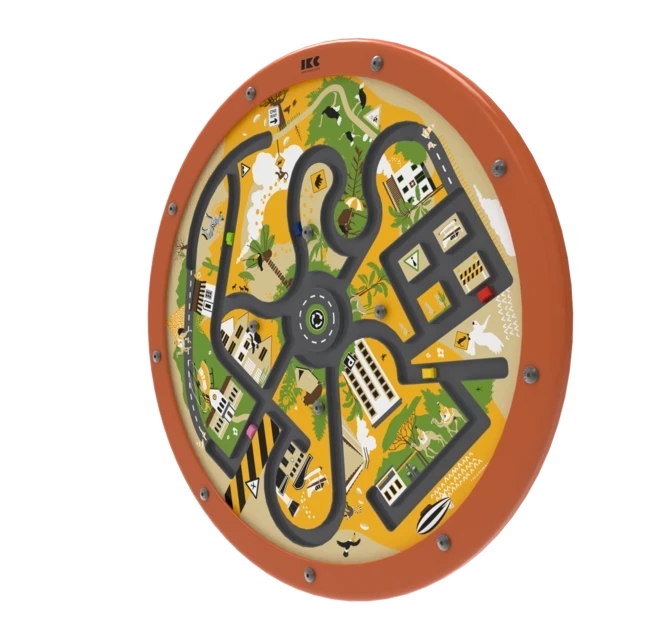 The round play panel can be mounted directly on the wall or attached to an IKC play system, making it a space-efficient solution. The frame is made of durable beechwood.