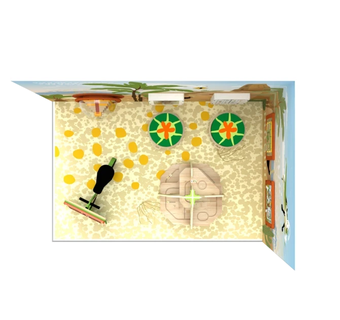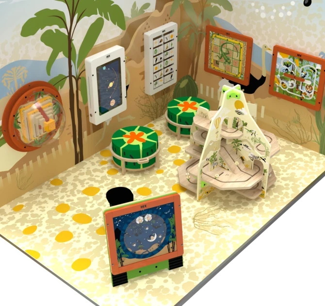 This play corner includes wall and floor decoration, three softplay elements, four interactive wall games, and the dune scooter and dune trail. In addition, the corner features an interactive play system with a 17-inch touchscreen. The touchscreen can be equipped with one of IKC’s educational and non-violent software options, specially developed for children.