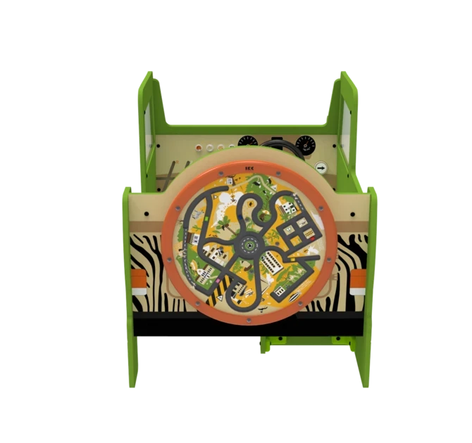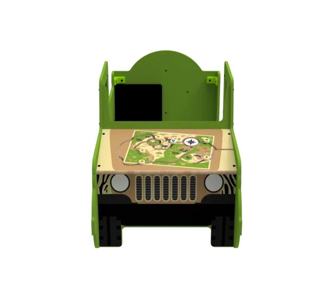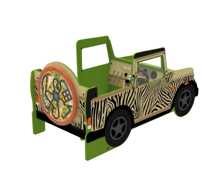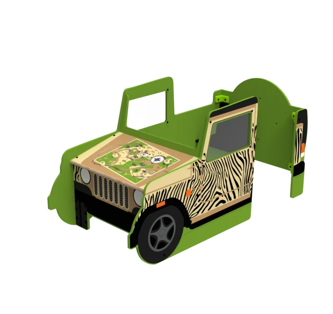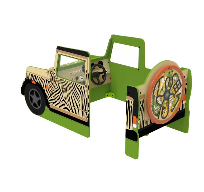 The Safari Jeep play system is a play element in the shape of a Jeep, featuring one wheel-mounted wall game. It can be used as a stand-alone play element or as part of a larger play corner. It also features a world map on the hood of the jeep with buttons attached to it so childeren can go on a safari on the hood of the jeep. On the inside of the jeep children can operate a magnetic switch panel to spark their imaginationeven more!