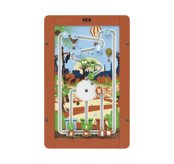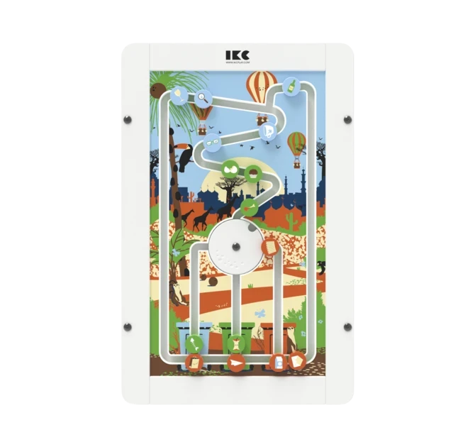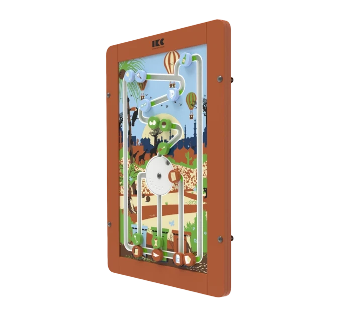 Sandy Sorter is an interactive wall game where children help clean up the desert by guiding different types of waste through the winding track and sorting them into the correct recycling bins. While playing, children learn about sorting and sustainability and develop their fine motor skills, problem-solving abilities, and hand-eye coordination.