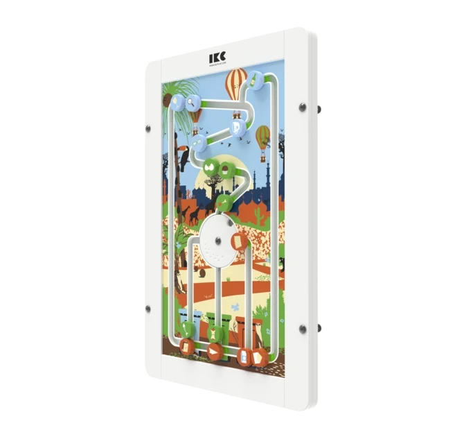 The play panel can be mounted directly to the wall or integrated into an IKC play system, making it a space-saving addition to waiting areas and play corners. The module contains no loose parts, making it safe, practical, and child-friendly. An additional FM frame is required for wall mounting.