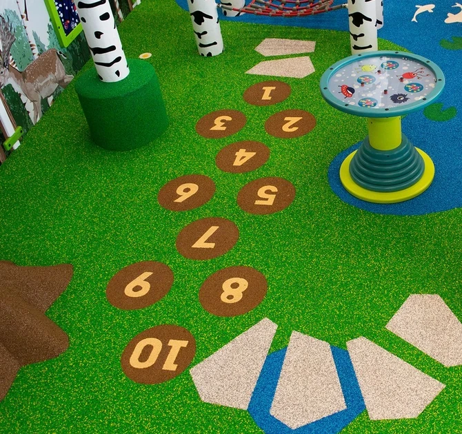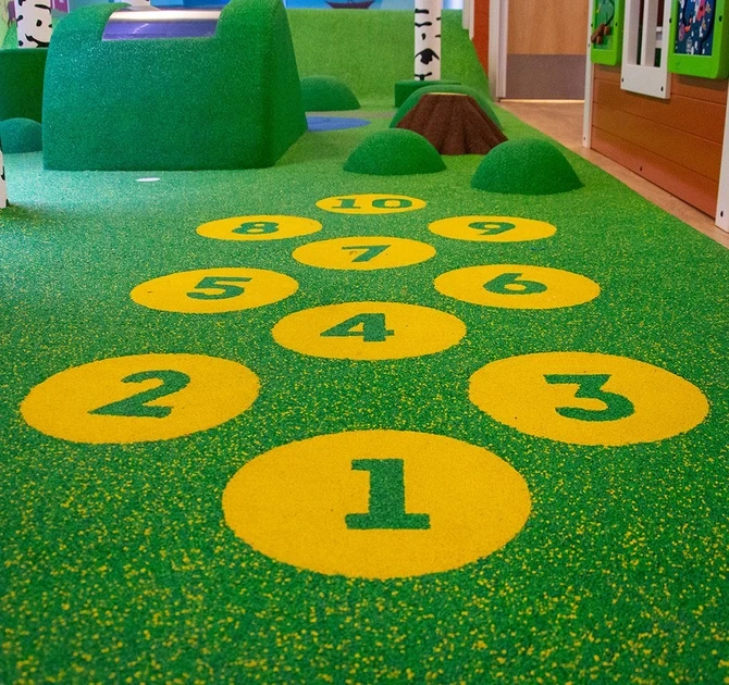 The EPDM is constructed from small rubber granules, making it possible to incorporate all kinds of figures and elements into the floor. A popular element to add to your play floor is the Hopscotch. This allows children to move around more by jumping over the numbers. To add extra play value, it’s also possible to enrich your play floor with other elements like fish, flowers and stepping stones.