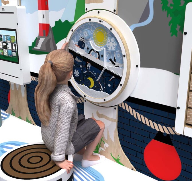 Day and Night es un juego rotativo en el que los niños pueden soltar las cuentas como la nieve girando una rueda. El juego de pared redondo tiene un marco natural y moderno hecho de madera contrachapada de abedul con un frente pintado de blanco que complementa muchos ambientes. Este juego de pared se puede utilizar como un elemento de juego independiente o combinado con los productos IKC existentes para crear una divertida esquina de juegos. El Day and Night está completamente diseñado por IKC y está serigrafiado.