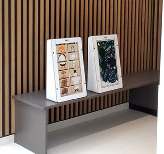 IKC tenía la solución perfecta para facilitar el juego a Saxenburgh. Al producir módulos de juego móviles en lugar de nuestros módulos de pared, los módulos ahora son fáciles de colocar en la sala de espera y en el resto del hospital. Con esta solución móvil, el hospital ofrece diferentes posibilidades de juego en diferentes lugares cada vez!