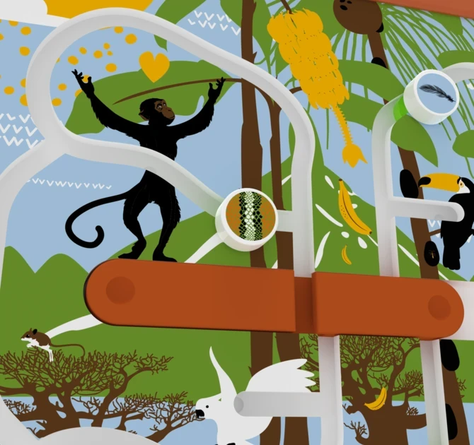 Este juego de pared cuadrado puede fijarse a la pared o a un sistema de juego IKC, por lo que no ocupa mucho espacio. El marco está hecho de madera de haya resistente y fácil de limpiar. Wild Pathways se puede combinar con softplays y muebles de IKC.