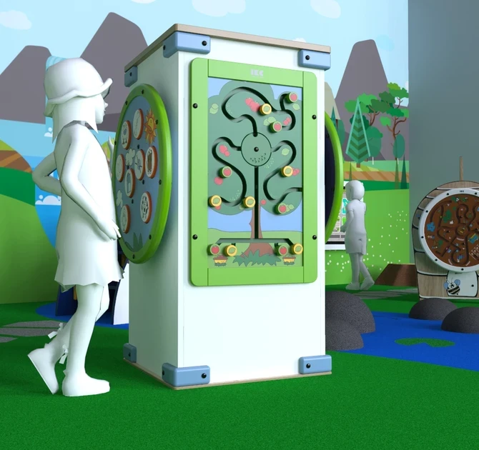 Sistema de juego Four fun es un elemento de juego en forma de torre, en el que se montan dos juegos redondos y dos de pared rectangular. El sistema de juego se puede utilizar como un elemento de juego independiente o como parte de un área de juego más grande.