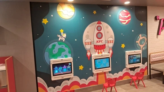 L’ancien mur nu est désormais un point central coloré qui donne vie à l’espace. Le thème spatial s’harmonise parfaitement avec l’intérieur moderne de KFC Mexique et permet à chaque membre de la famille de se sentir le bienvenu.