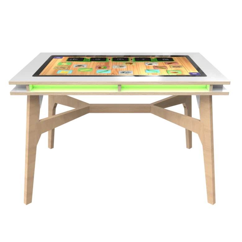 Le One 4 All Touch Table DeLuxe est un système de jeu interactif élégant qui propose 24 jeux de société différents. Ces jeux sont adaptés à tous les âges. Nos designers ont étendu la plaque de verre sur les côtés. Il est facile de voir à qui c’est le tour de jouer, car une bande de couleur lumineuse s’éclaire. Ce look moderne lui permet de s'intégrer dans n'importe quel intérieur. Nous proposons également cette table dans un style en bois avec l'éclairage sur les côtés. En savoir plus sur la table de jeu familiale en bois. Nos développeurs ont conçu un logiciel spécial, qui permet à 4 joueurs de jouer ensemble. Il n'y a pas de pièces détachées, ce qui donne un aspect ordonné et vous évite d'avoir des parties incomplètes. Jetez également un coup d'œil à notre nouveau logiciel BRYM, spécialement conçu pour la table tactile One 4 All. Contactez nous