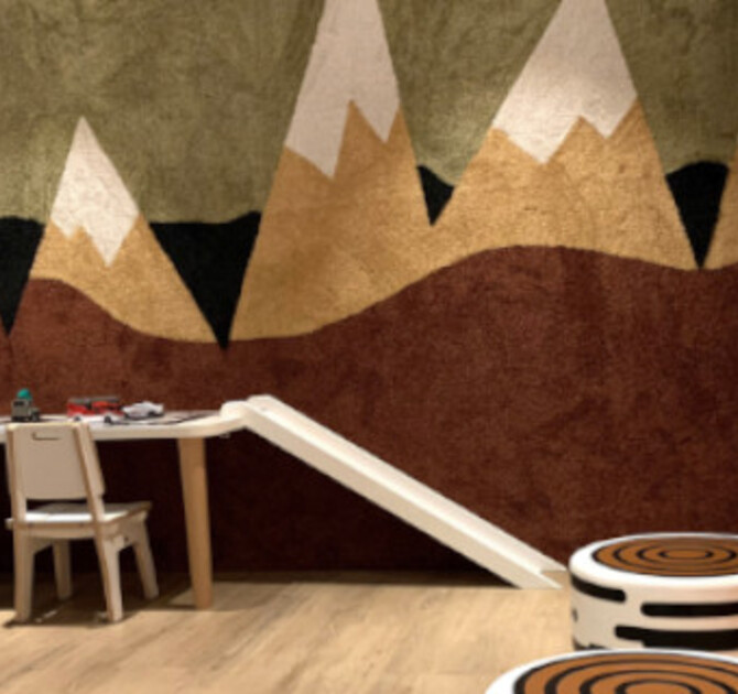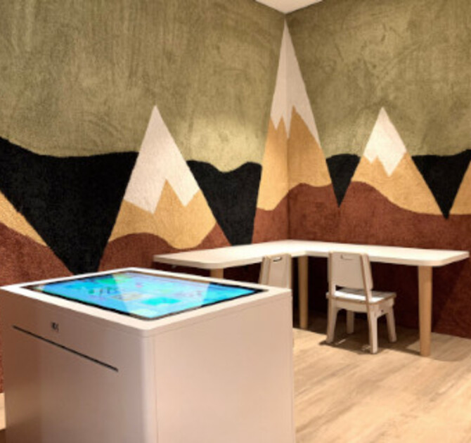De speelhoek is geplaatst in een aparte ruimte met een ingang speciaal voor kinderen. Er is gekozen voor een unieke wandbekleding, namelijk: vloerbedekking in een prachtig bergdesign. Naast de warme en zachte uitstraling van de ruimte, was de grootste reden om voor vloerbedekking te kiezen vanwege het geluiddempende effect. De kinderen kunnen hun lol op in de kinderspeelhoek en het geluid blijft grotendeels in de ruimte.