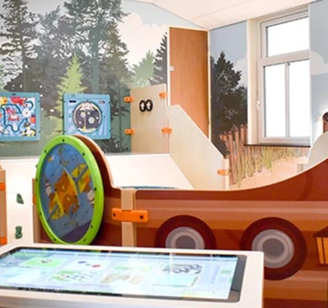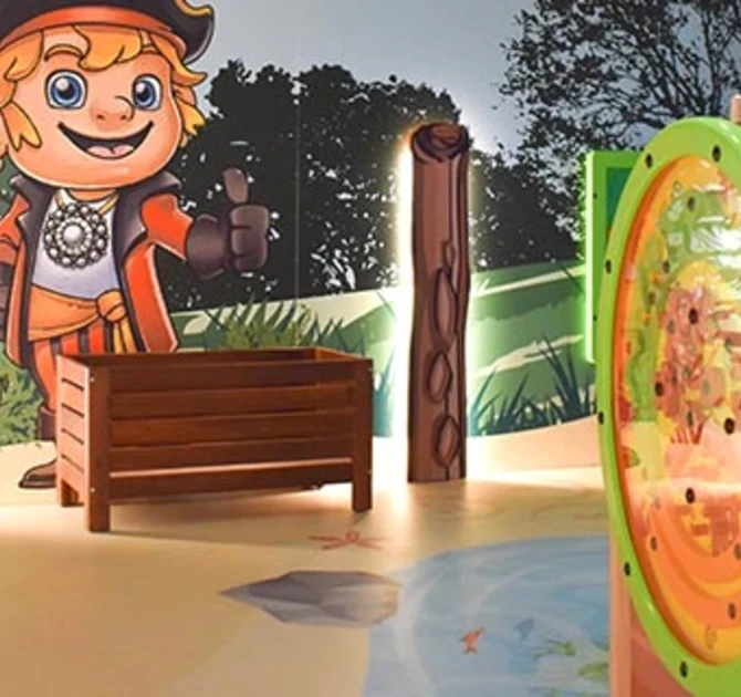 La direzione ha richiesto la realizzazione di uno spazio dove i bambini possano giocare in un ambiente a tema. IKC ha creato l'angolo di gioco a tema Pirati. Abbiamo incluso i muri e i pavimenti nella tematizzazione. Qui i bambini incontrano diversi elementi.