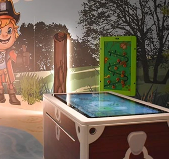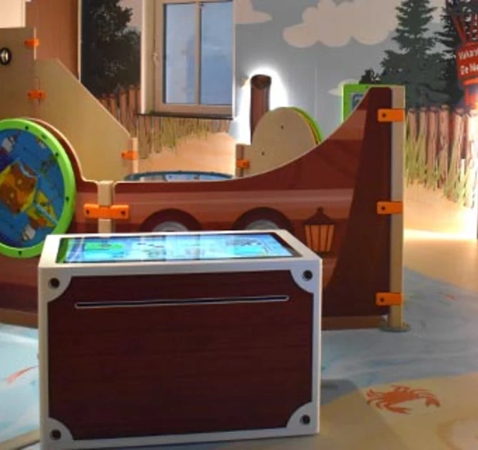 Abbiamo trasformato il touchtable da 32 pollici in un grande scrigno del tesoro. Su questo scrigno i bambini possono divertirsi con diversi giochi interattivi. La recinzione che abbiamo posizionato nella stanza completa l'esperienza, questa recinzione l'abbiamo trasformata in una grande barca dei pirati.