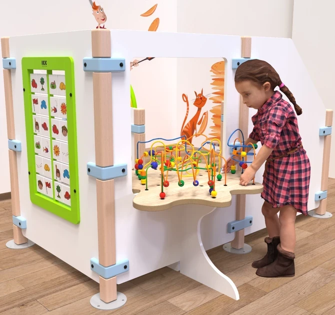 Il tavolo Recinzione con Beadstree table è un pannello di gioco in cui abbiamo aggiunto il popolare e noto tavolo wirebeads. I bambini possono giocare con le tele metalliche da entrambi i lati della recinzione.