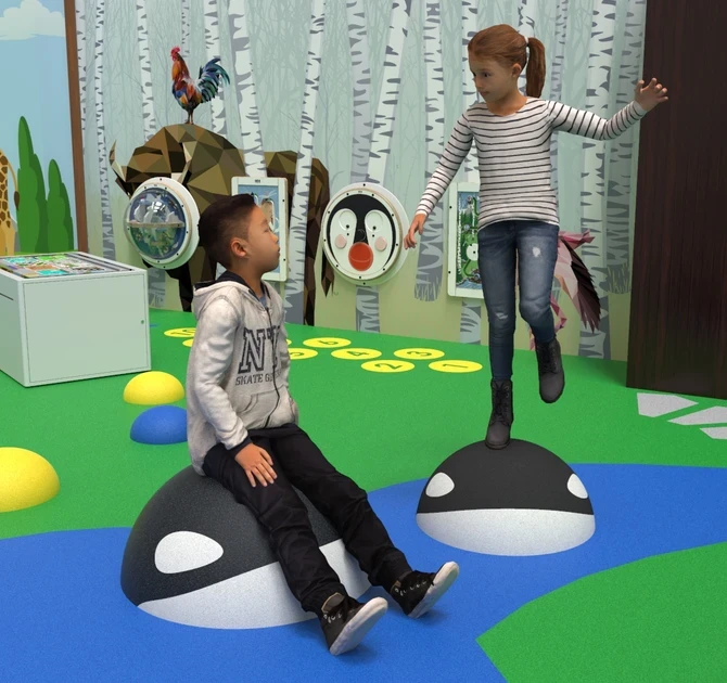 フロアをゴム粒子のEPDMにする利点は色々なオブジェやデザインを組み合わせることができる点にあります。シャチもフロアにバリエーションを加えるためのエレメンツのひとつです。立体型3Dではその他に切り株などもあります。